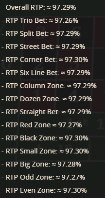 奇怪的是,幫助文件列出的每種投注的回報率略有不同。例如,黑色的回報率為 97.30%,而紅色的回報率為 97.27%。