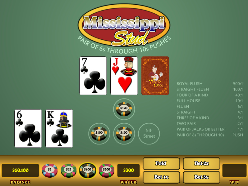 密西西比梭哈是過去十年來最成功的撲克遊戲之一。其目標是獲得一手高等級的五張牌。沒有莊家牌可以擊敗。當牌面亮出後,玩家必須決定是小額加註、大額加註還是棄牌。這個策略很容易寫在一張索引卡上。