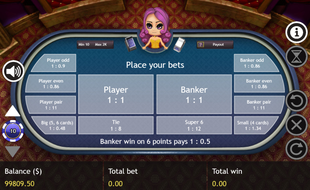 百家樂遊戲遵循標準規則,莊家獲勝賠率為0.95。遊戲中有幾種邊注,與下文「超級6」部分的邊註完全相同。唯一的差別在於,莊家的賭場優勢為1.06%,而「超級6」為1.46%,而且「超級6」沒有邊注。