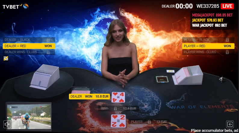 元素戰爭是賭場戰爭的升級版。遊戲使用一副牌。玩家可以押注獲勝方,也可以進行各種附加投注。賠率會隨著荷官的發牌而動態更新。它看起來與賭注戰爭非常相似。