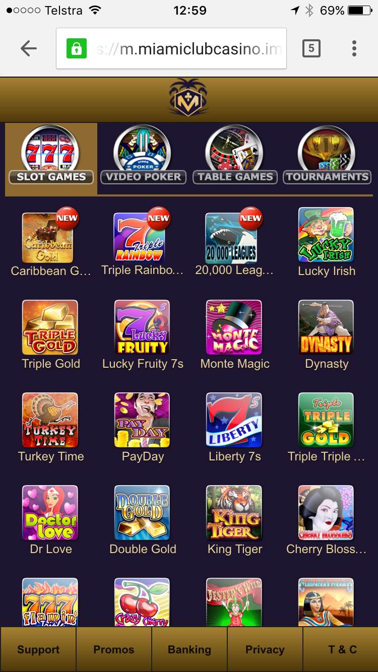 另一個可以享受「賠率奇才」廣告保證的賭場是邁阿密俱樂部賭場 (Miami Club Casino) 。同樣,行動裝置上無法像電腦一樣提供所有遊戲。例如,在「賭桌遊戲」下,似乎只有六款遊戲,包括四種版本的二十一點,而且不知何故,他們還包含基諾遊戲,而我認為基諾遊戲不屬於賭桌遊戲。邁阿密俱樂部網站上的遊戲數量是其三倍多。